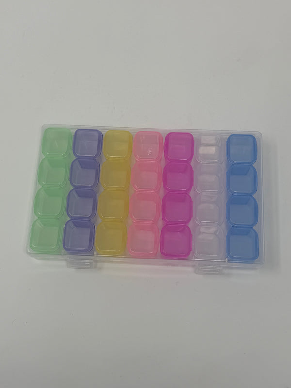 Plastic organizer box for face paint gems or other small accessories. Clear exterior box with 28 interior multi-colored boxes.